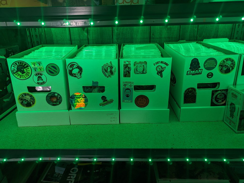 My goal was to just put these under the shelves to help light up the comic boxes, but I realized that two 50 foot strips was way too much to do under. I decided to do two loops around each shelf and one directly under it.