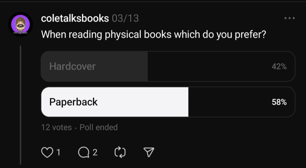 I recently ran a poll on Threads asking readers which format they preferred, and I was surprised to see paperback come out on top! It got me thinking—what makes one better than the other?
