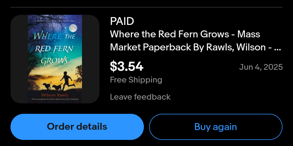 While I’m a very big reader now, I was not a huge reader in my childhood.  However, one of the books I really remember and stuck with me was Where the Red Fern Grows as this is a book my mother read to me.  I remember my mom crying at the end and me being like “mom can you stop crying so we can finish this” 😂 .  Can’t wait to share a similar memory with my kids, which is why I ran to eBay and grabbed a copy.